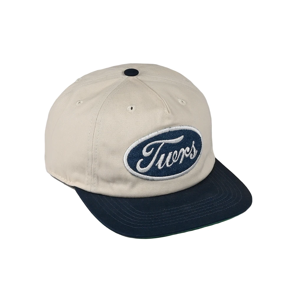 Towers LTD logo embroidered on the front of a low profile unstructured 5-panel hat with a green underbill and a snap back closure. Designed and individually embroidered in Austin, TX.