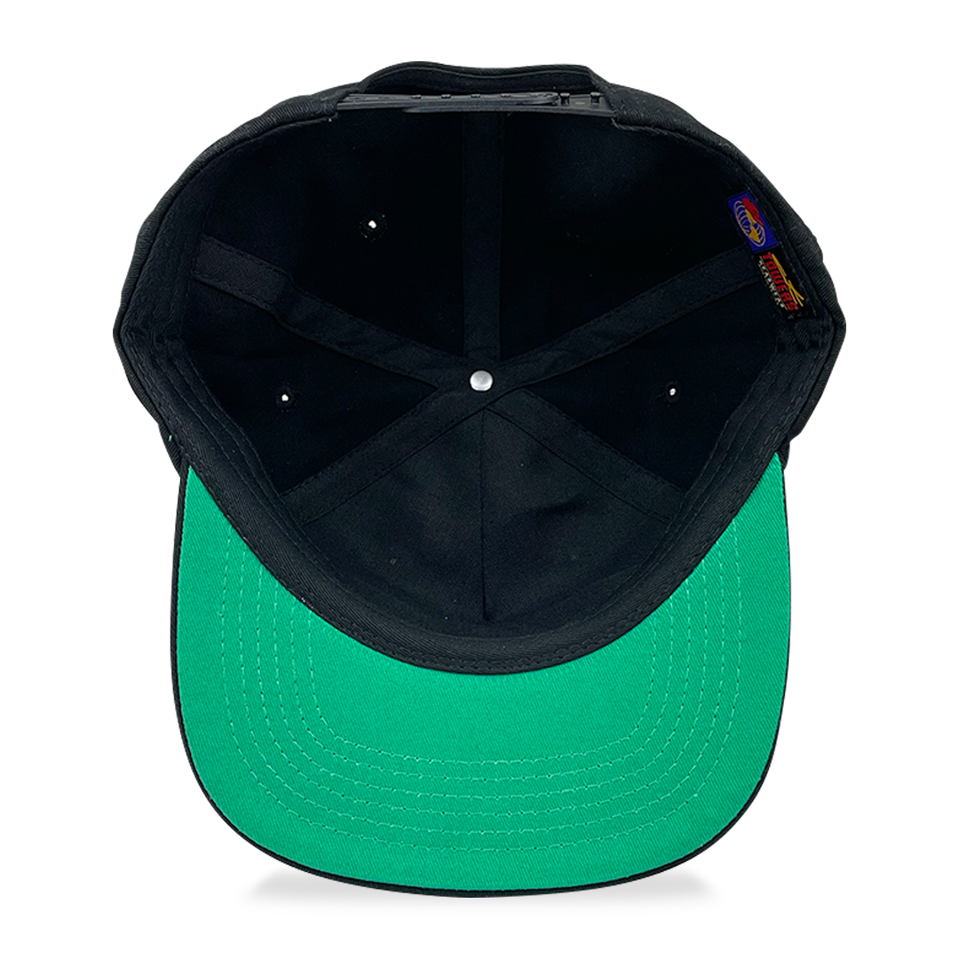 Pyramids logo embroidered on the front of a low-profile unstructured 5-panel hat with a green under bill and a snap back closure. Designed and individually embroidered in Austin, TX.