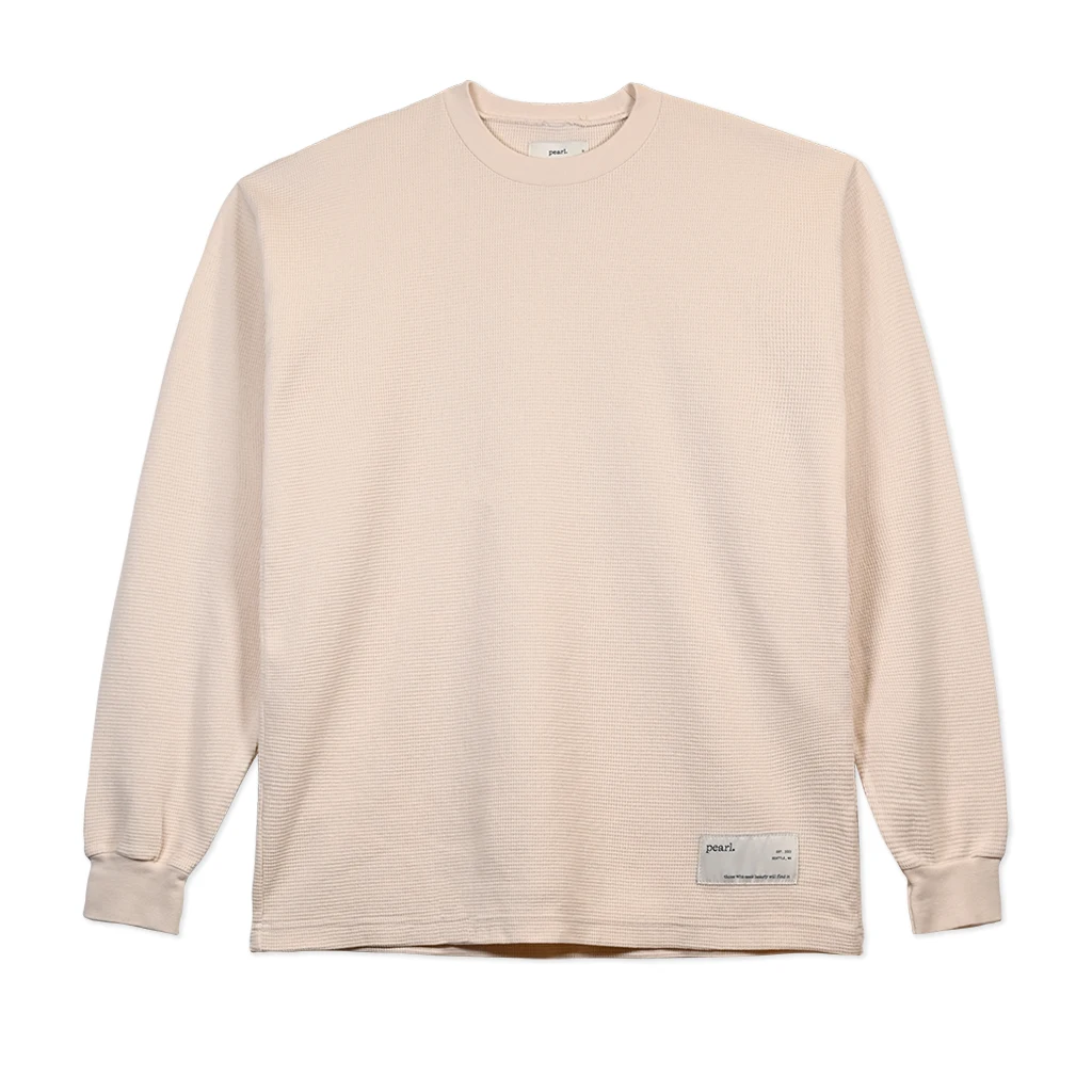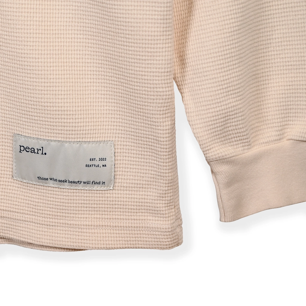 Pearl Field Issue thermal shirt with woven labels sewn bottom left of a mid-weight cotton long sleeve shirt.