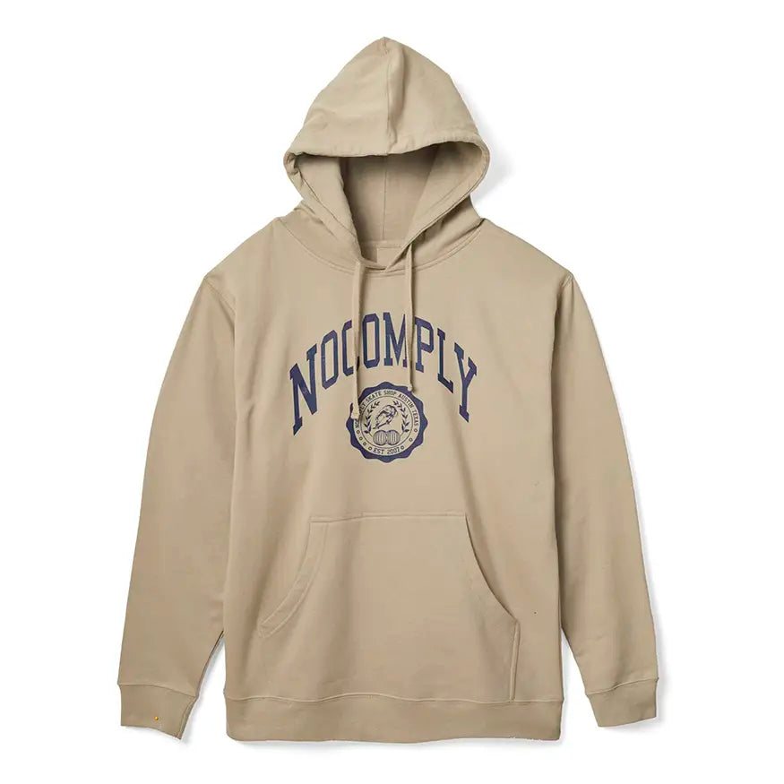 Logotipo clásico de No-Comply inspirado en la universidad impreso en una sudadera con capucha de peso medio. Impreso en el centro de Texas.