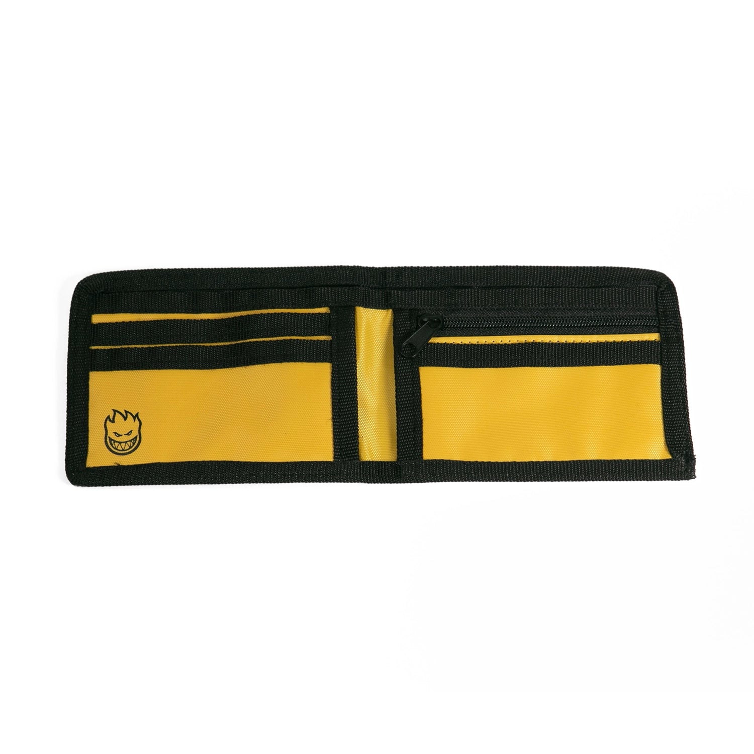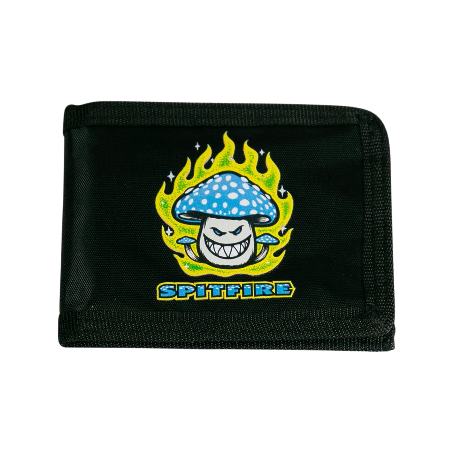 Billetera plegable Spitfire Mushroom con logotipo serigrafiado, un compartimento grande para billetes, ranuras para tarjetas y un compartimento con cremallera.