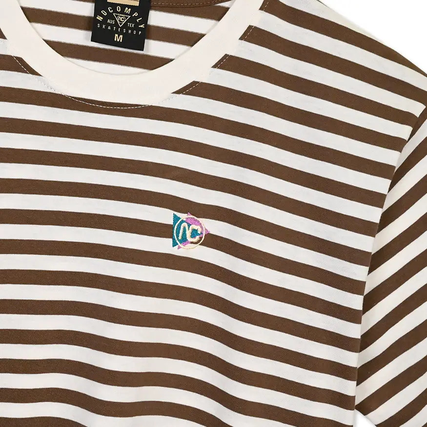 No-Comply Violet Crown Label Tri-Arc Mini logo embroidered on left chest of a cotton striped t-shirt. Locally grown since 2007.