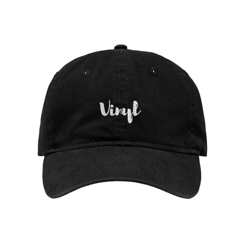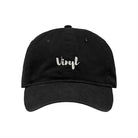 Vinyl Script logo embroidered on the front of an unstructured 6-panel dad had with a strap back closure.